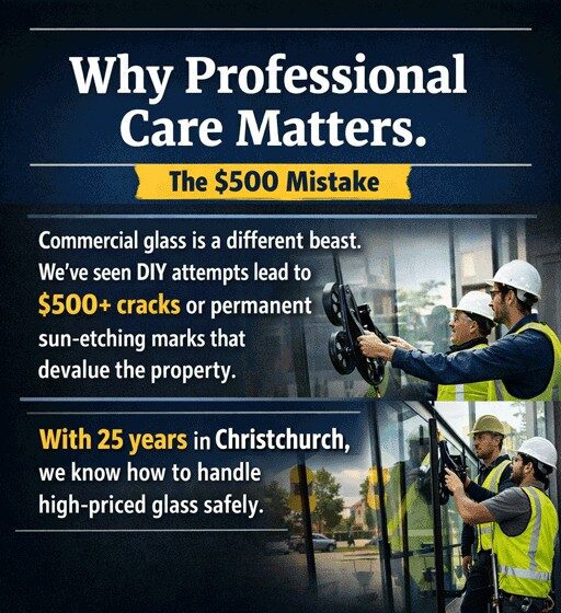 Commercial glass is a different beast. We’ve seen DIY attempts lead to $500+ cracks or permanent sun-etching marks that devalue the property. With 25 years in Christchurch, we know how to handle high-priced glass safely.